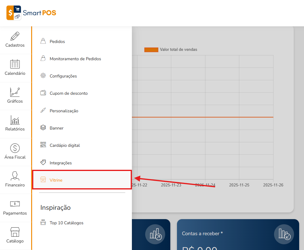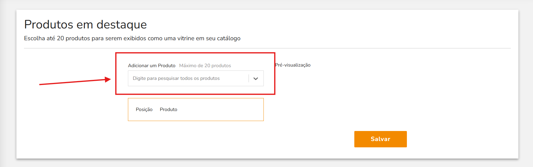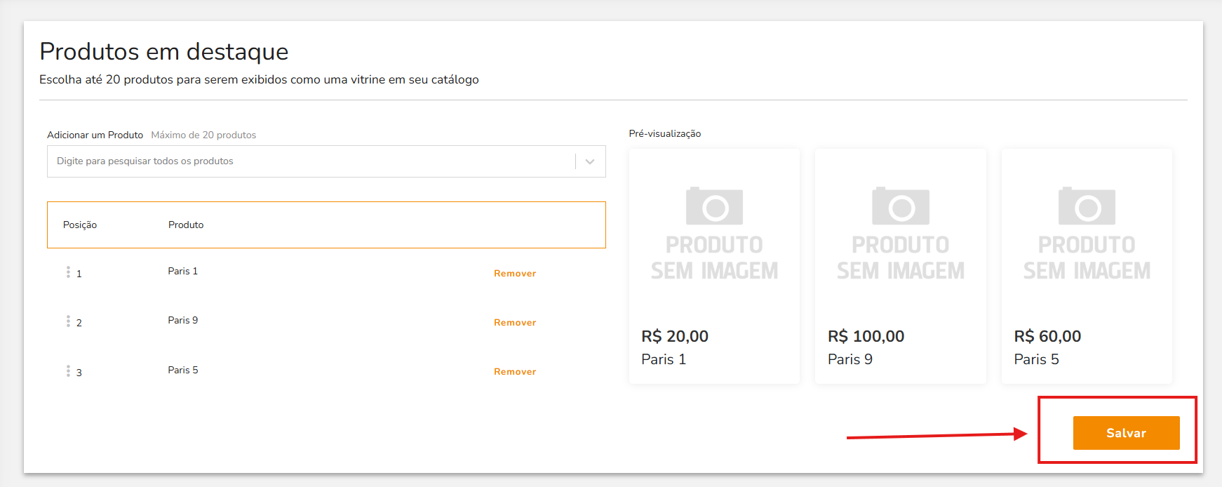 🔹 Importante: A vitrine permite adicionar até 20 produtos. Esses produtos serão exibidos em destaque na tela inicial do catálogo online.