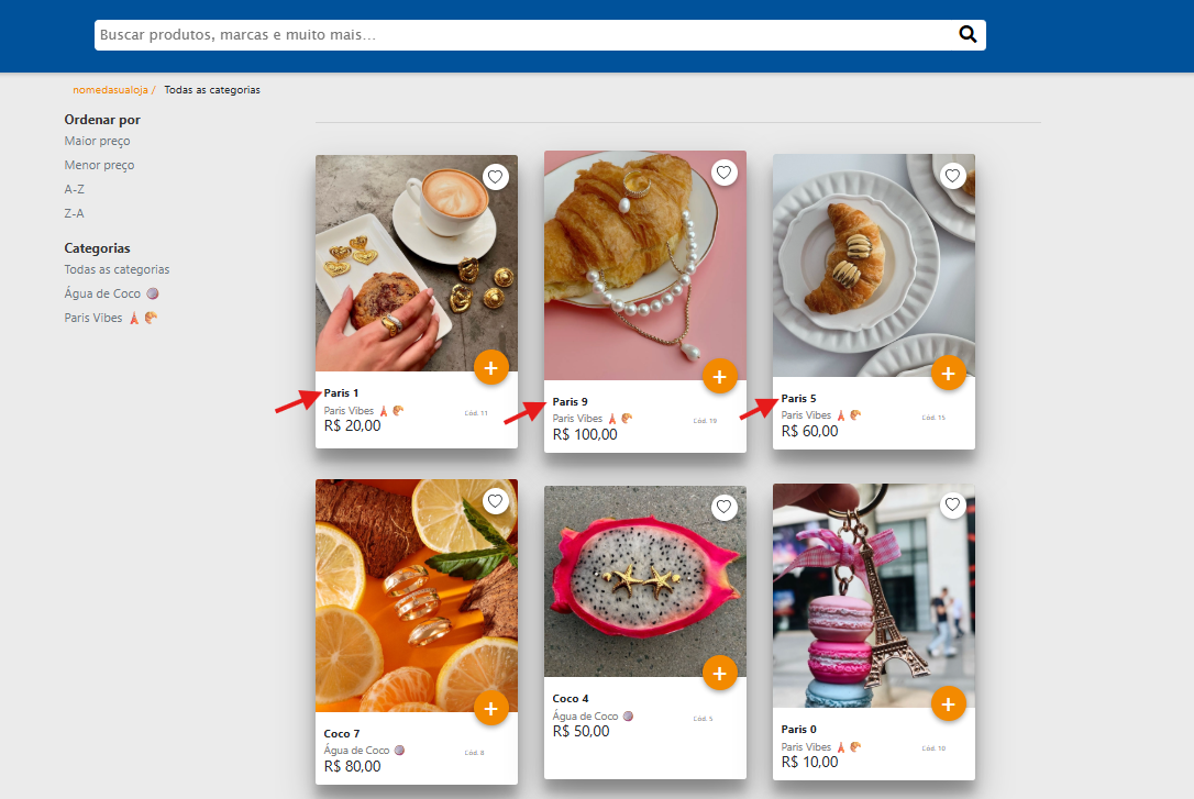 - Você pode alterar a posição dos produtos na ordem que deseja que eles apareçam: basta clicar e arrastar o produto para a posição desejada.