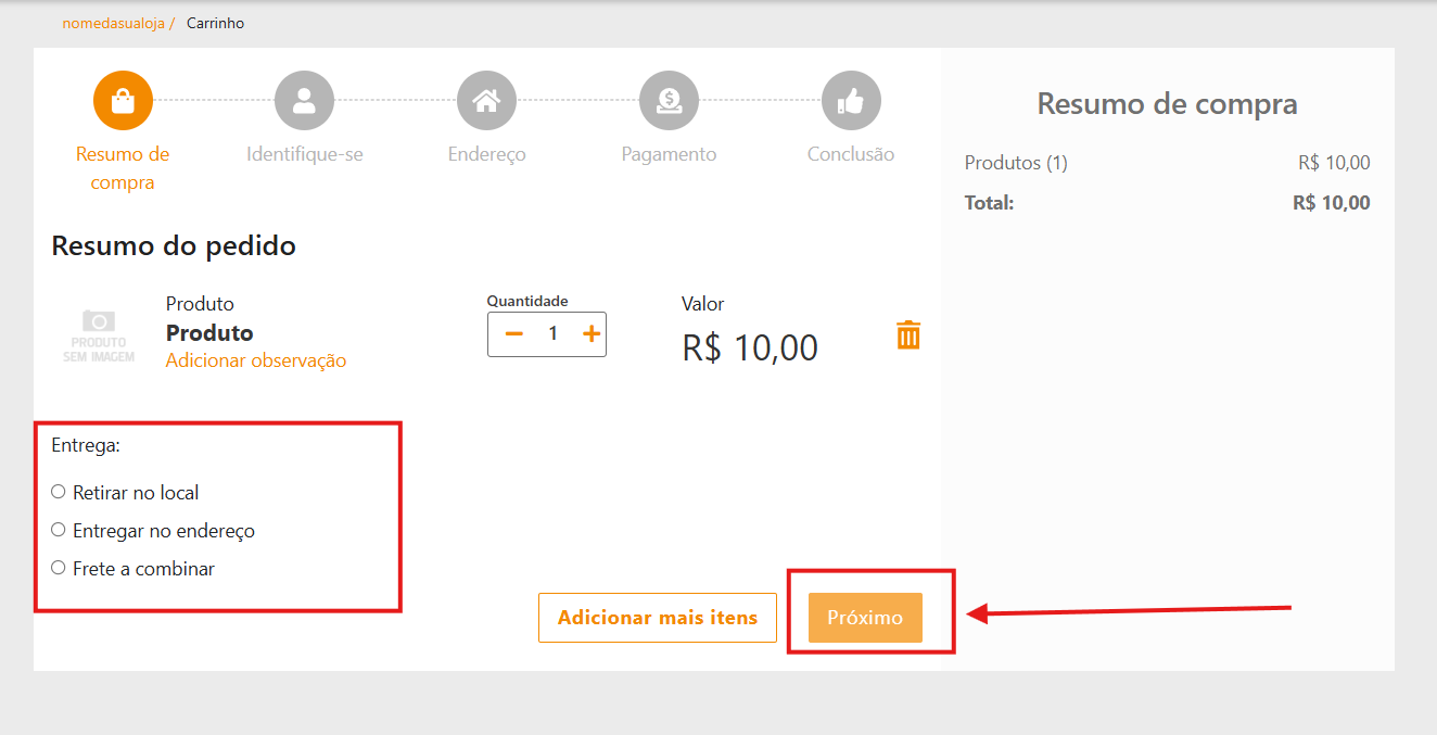 - Ao avançar, informe o tipo de entrega de acordo com o seu negócio e clique em Próximo