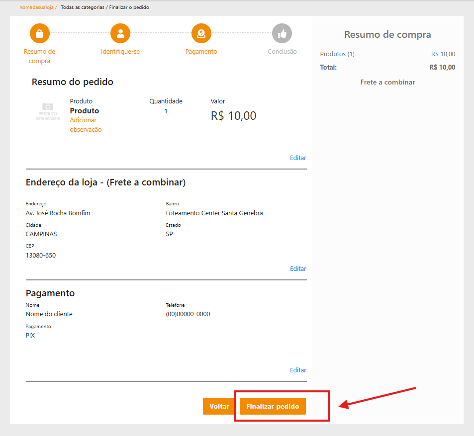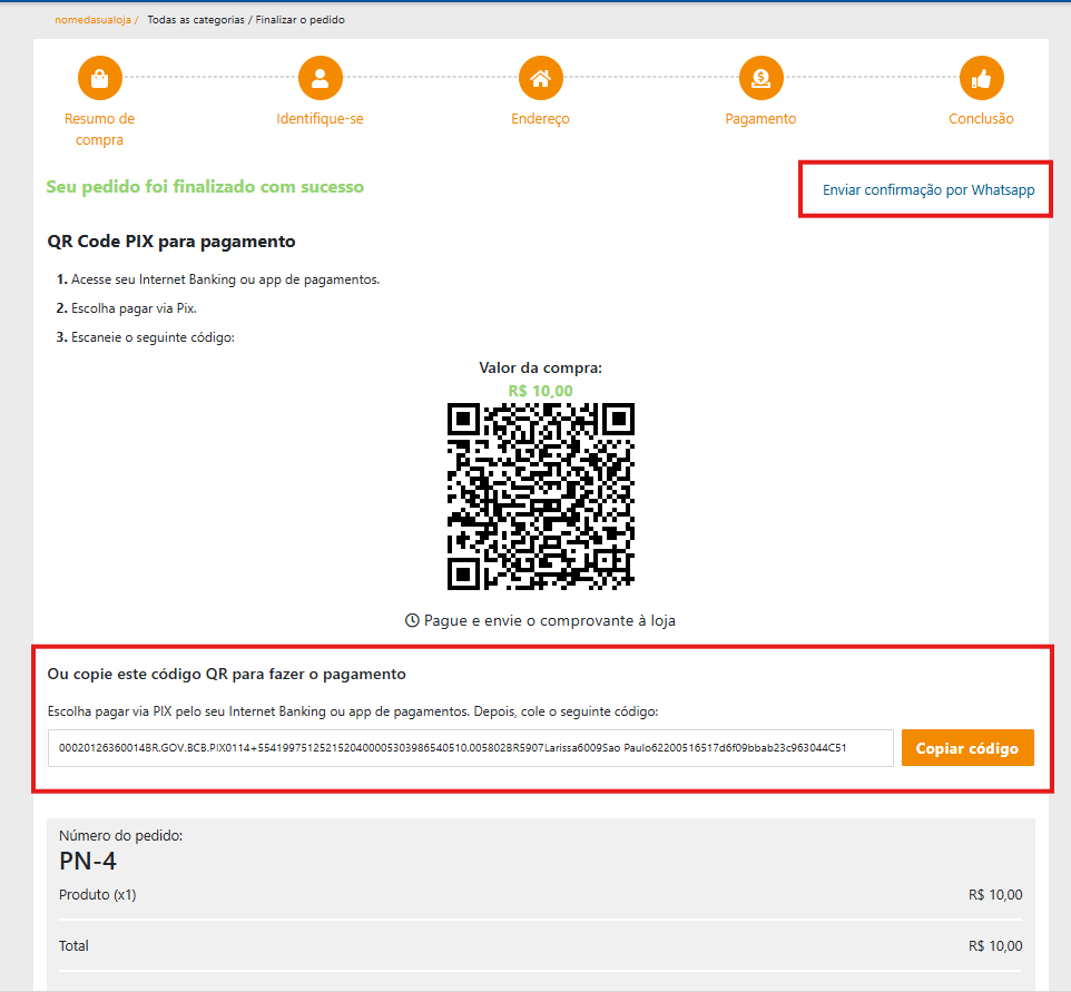 - Ao finalizar, você verá o resumo do pedido. Dependendo da forma de pagamento escolhida, é possível enviar o link de pagamento para o cliente ou finalizar via WhatsApp.