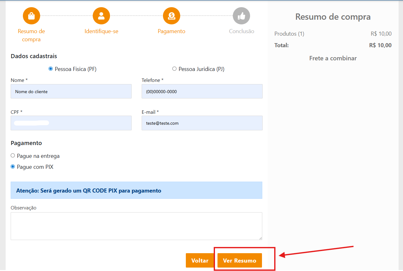 Preencha os campos obrigatórios (sinalizados com asteriscos) e clique em Ver Resumo para avançar