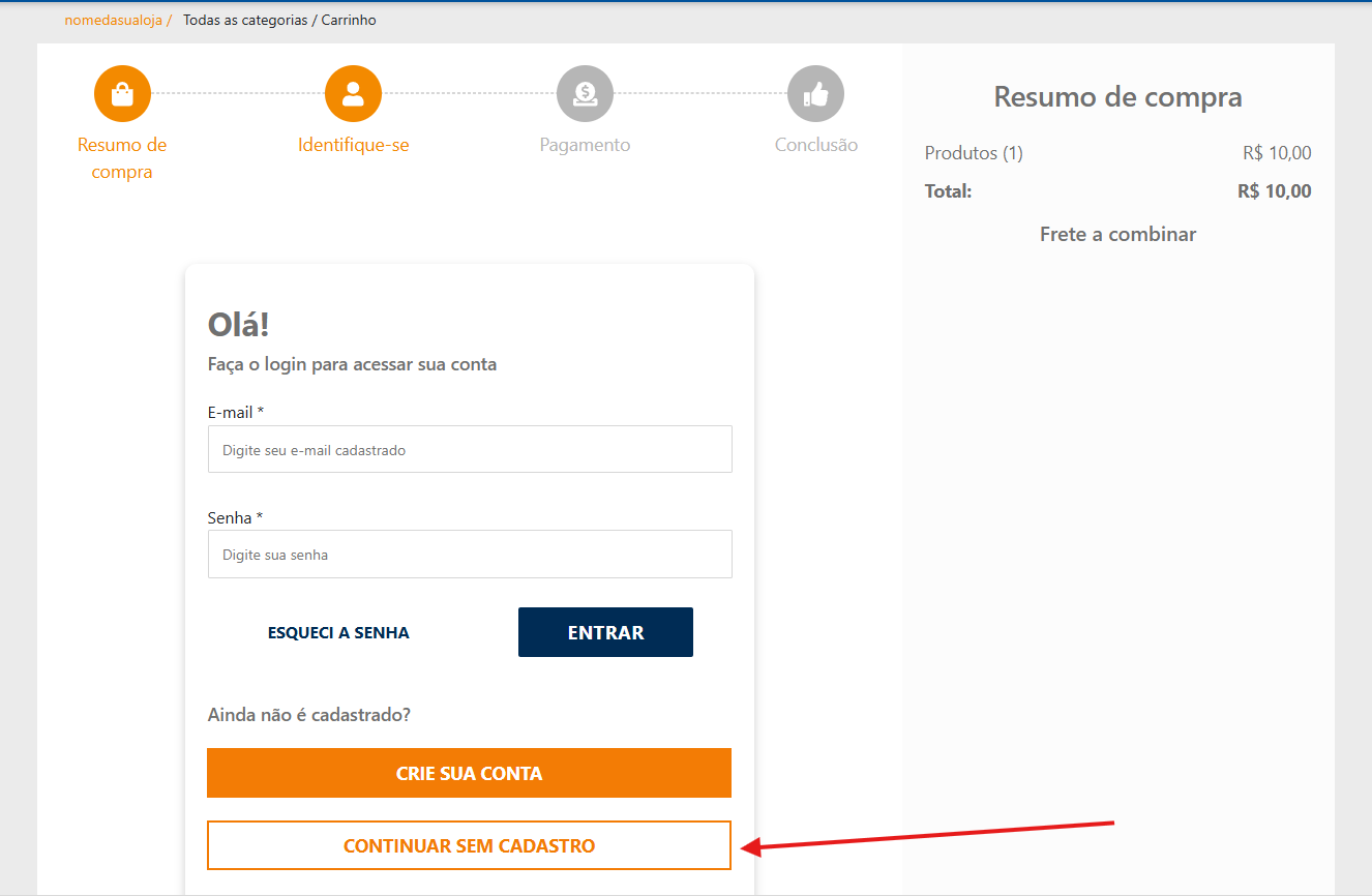 Insira os dados do cliente que está realizando a compra. Caso queira, clique em Continuar sem cadastro, não é obrigatório criar uma conta para finalizar o pedido. O preenchimento varia conforme o tipo de entrega.